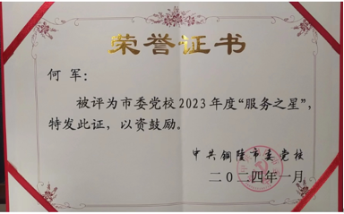 2024年1月29日铜陵市委党校召开2023年全校工作总结暨表彰大会。我公司驻点人员何军同志被评为市委党校2023年度“服务之星”。