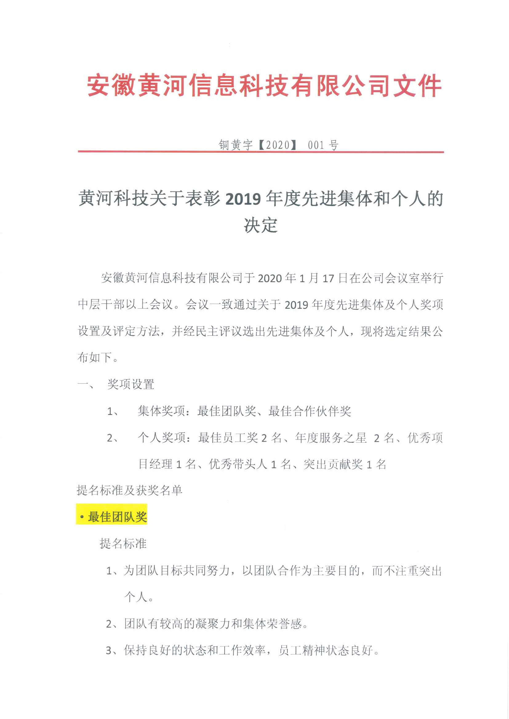 黄河科技关于表彰2019年度先进集体和个人的决定文件